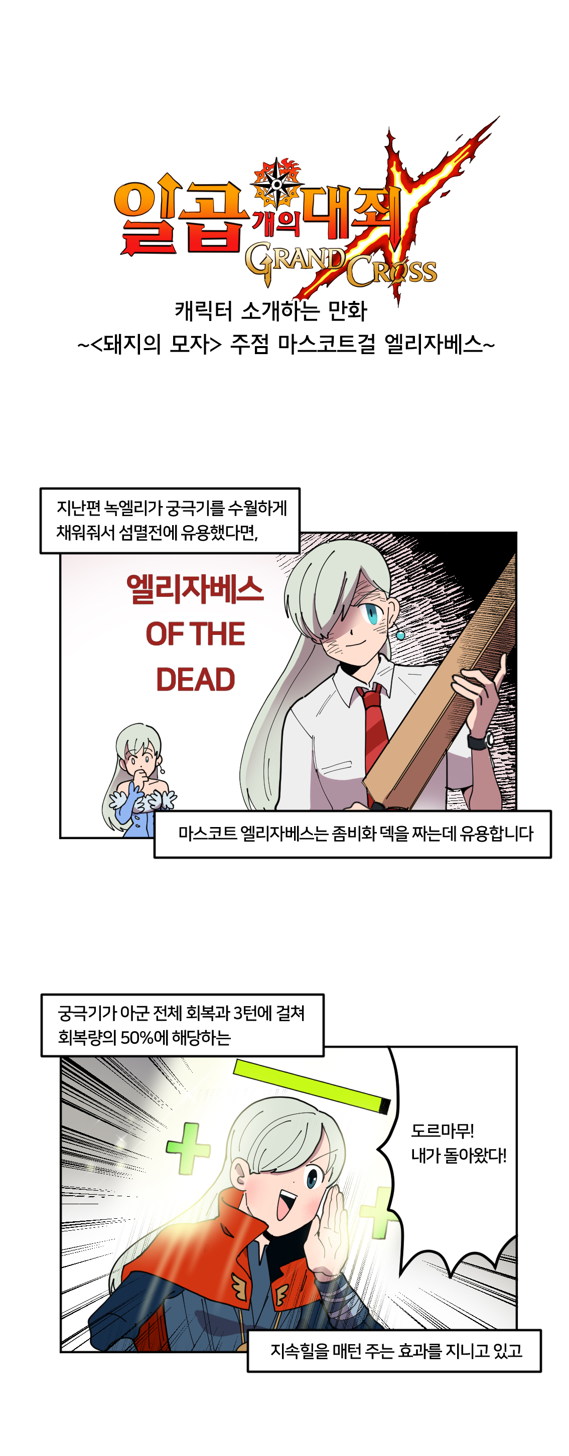 웹툰으로 보는 일곱개의대죄:그랜드크로스 7화에서는 '<돼지의 모자> 주점 마스코트걸 엘리자베스'를 소개한다. 해당 영웅은 '마스코트걸 엘리'로 불리어지는데, 지속힐 및 개성을 기반으로 아군 영웅에게 계속해서 체력을 채워주는 것이 가장 큰 특징.