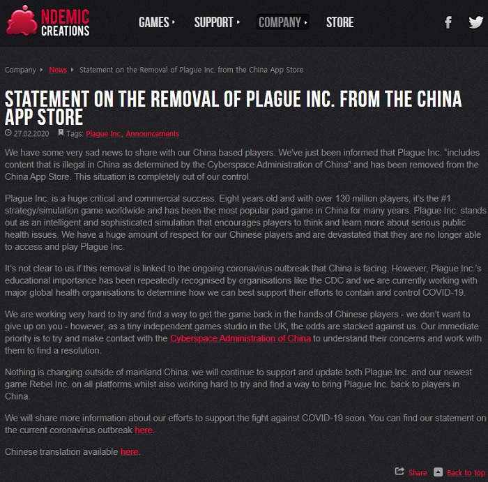 이에 대해 엔데믹크리에이션즈는 "1억 3천만 명에 달하는 플레이어가 전염병주식회사를 즐기는 등, 전세계 1위를 기록한 전략 시뮬레이션이며 중국에서도 가장 인기있는 유료 게임"이라 밝히며, "더 이상 중국 게이머가 전염병주식회사를 즐기지 못하는 것에 대해 유감"이라고 전했다.
