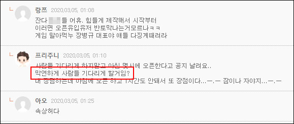 문제는 두 번째 공지에서 몇 시 오픈인지 밝히지 않아 자정이 넘어 새벽까지 게임을 기다리고 있는 유저들이 많은 혼란을 겪고 있다는 점이다. 많은 게이머들은 테라히어로 공식 카페 두 번째 오픈 지연 공지 댓글과 히어로 수다 게시판(자유 게시판)에 '그래서 몇 시에 오픈하겠다는건가요?', '자라는건지 말라는건지?', '잠자고 싶다. 공지좀 해줘' 등의 의견을 남기고 있다.