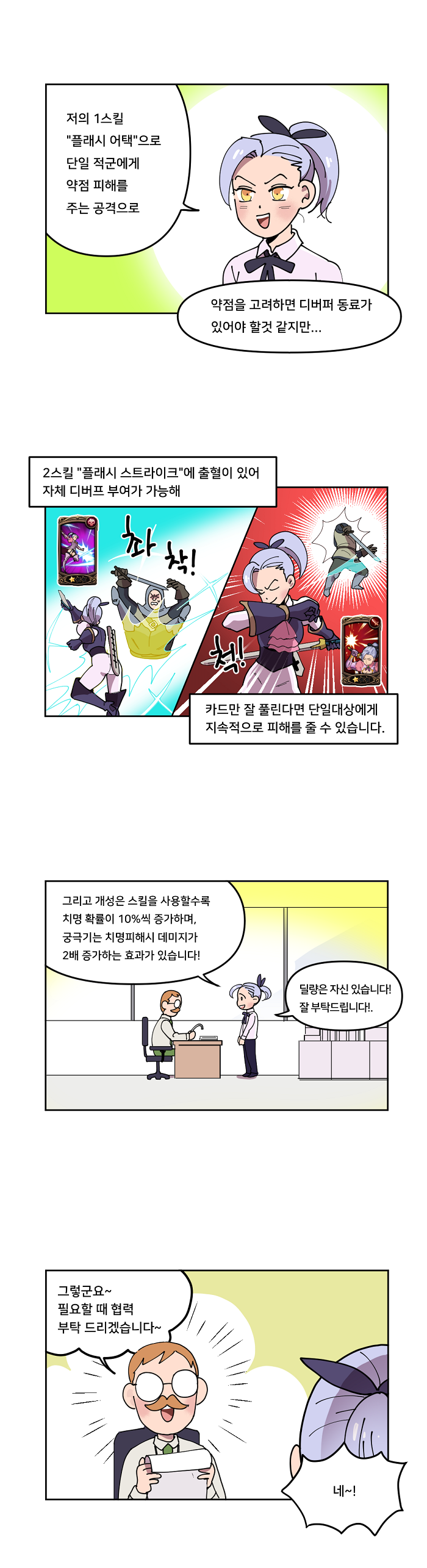 따라서 어떤 캐릭터로 어떤 조합을 하느냐가 매우 중요한데, 그 중에서도 몇몇 캐릭터는 덱 내에서 매우 중요한 역할을 한다. 이에 웹툰 작가 '국도'가 추천하는 영웅 캐릭터를 살펴봤다. 국도는 웹툰을 통해서 영웅 캐릭터를 추천하고, 해당 영웅을 어떻게 활용해야할지 재치있게 표현했다.