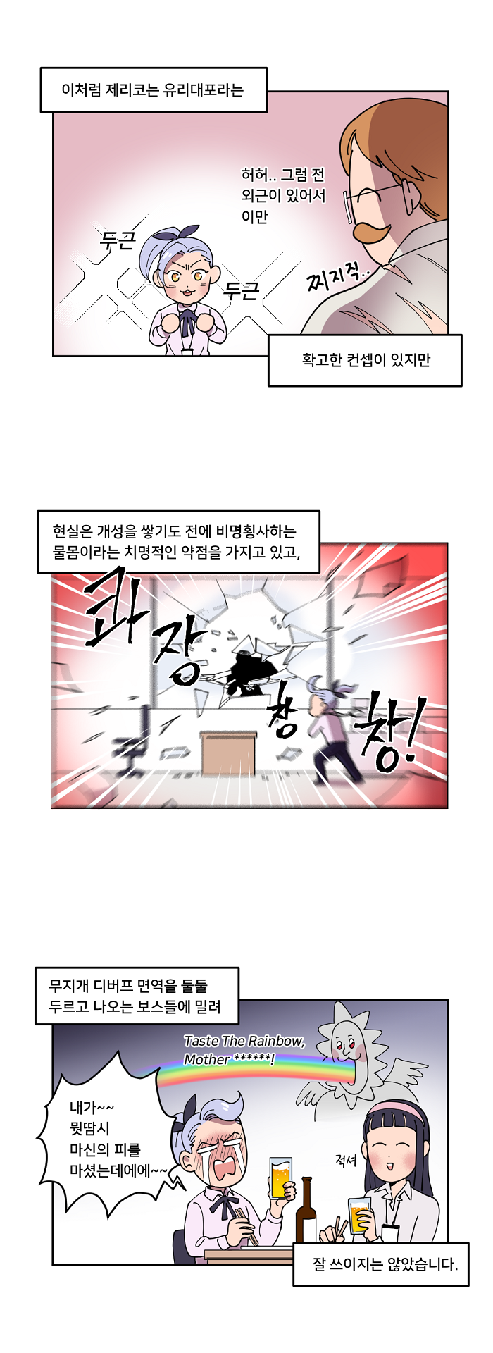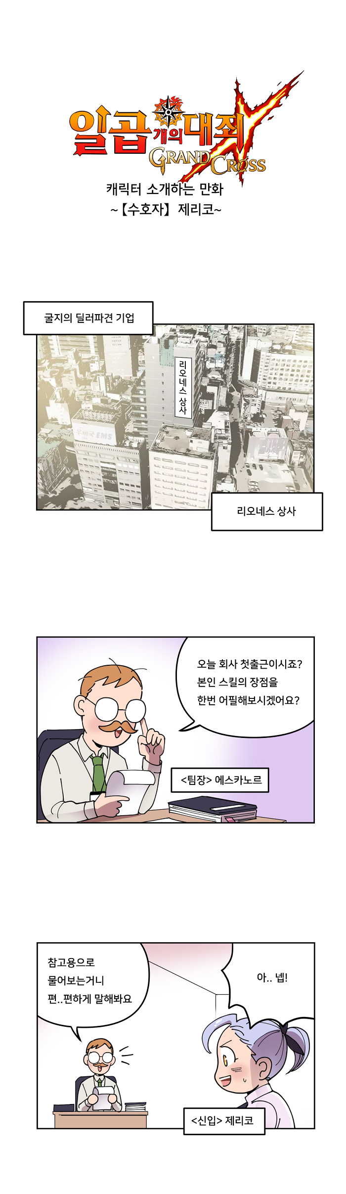 이에 '유리대포'라는 별명을 가지고 있는 녹리코의 이야기를 웹툰으로 재미있게 풀어냈다. 아래는 웹툰으로 보는 일곱개의대죄:그랜드크로스 9화, '제리코 단일딜러 최강되는 상상함' 편이다.