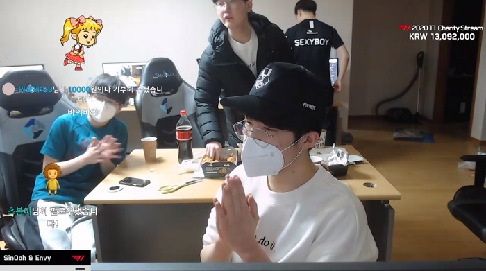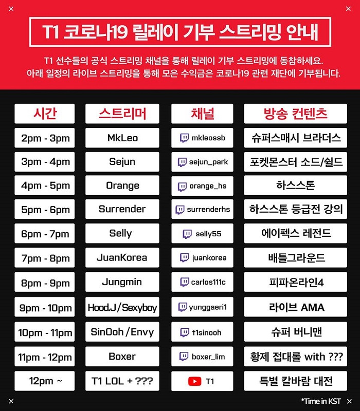 오후 2시부터 시작해 다음날 새벽까지 진행된 릴레이 기부 스트리밍은 T1 소속 선수들이 1시간 단위로 방송을 진행하며 획득한 도네이션(트위치tv 플랫폼 기부금)은 코로나19 관련 재단에 기부하는 형태의 방송이었다.