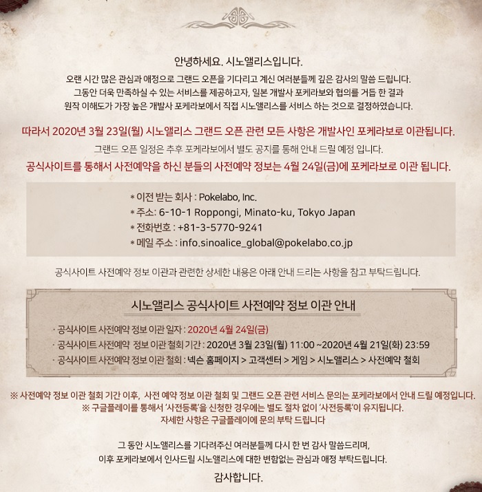 이에 따라 23일 시노앨리스 그랜드 오픈 관련 모든 사항은 개발사인 포케라보로 이관되며, 공식 사이트를 통해 사전예약을 한 사람의 사전예약 정보 역시 오는 4월 24일에 포케라보로 이관될 예정이다. 만약 포케라보로 사전예약 정보가 이관되길 원치 않는다면 넥슨 홈페이지 내 고객센터를 통해 오는 4월 21일까지 시노앨리스 사전예약을 철회할 수 있다.
