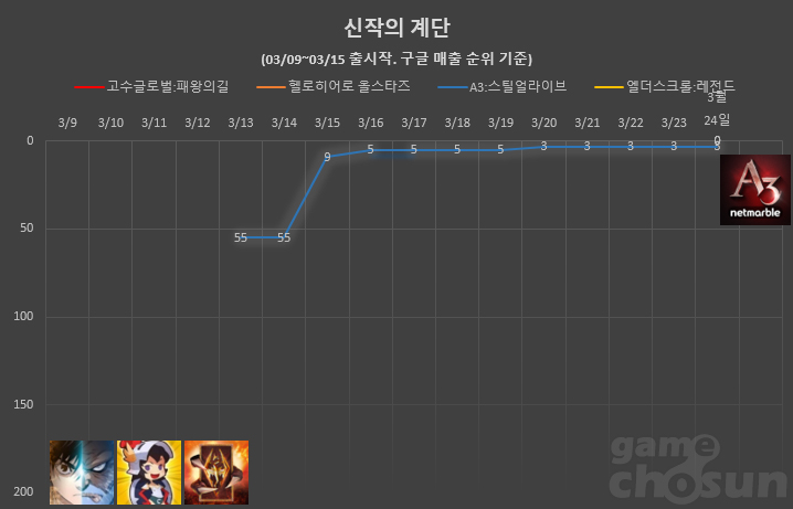 특수한 기대작을 제외하면 월 기준 200위권 내 진입조차도 쉽지 않은 성적이라는 점을 감안하면 대체로 좋은 성적을 거둔 셈. 테라 히어로와 A3:스틸얼라이브 등 대작 타이틀이 연달아 출시한 이후의 성적이라 더 값진 성적으로 보인다.