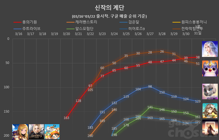 다수의 타이틀이 집중됐던 3월 중순, 첫 주 성적이 좋았던 룽투코리아의 MMORPG '용의 기원'이 꾸준히 상승하여 38위에 올라섰다. 꾸준한 성장폭이 눈에 띈다. 반면에 20위권까지도 진입했던 라이엇게임즈의 '전략적 팀 전투'는 주말을 기점으로 하락하여 51위에 머물렀다. 과금 비중이 크지 않은 장르인 탓에 이후 드라마틱한 변화는 없을 것으로 보인다.