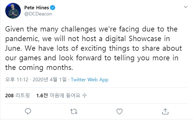 '엘더스크롤'과 '폴아웃' 시리즈의 개발사로 유명한 '베데스다'는 코로나19 사태로 인해 '퀘이크콘(QuakeCon)' 행사를 취소한데에 이어서 온라인으로 진행하는 '디지털 쇼케이스'도 진행하지 않을 계획이라 밝혀 수많은 게이머가 아쉬움을 표하고 있다.