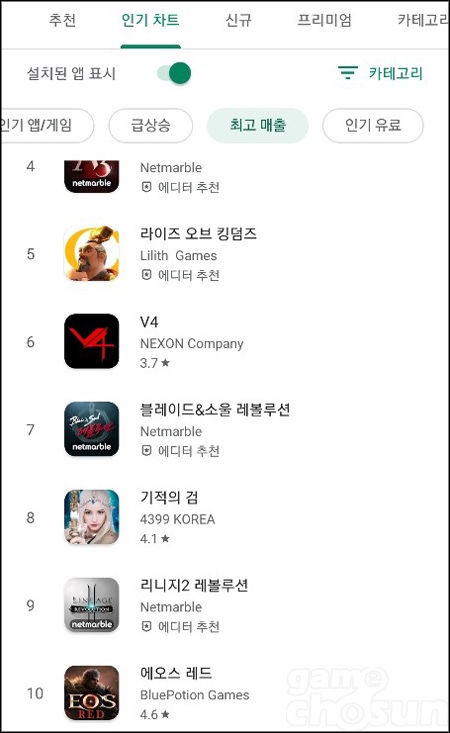 13일 구글 플레이스토어 매출 순위 = 게임조선 촬영