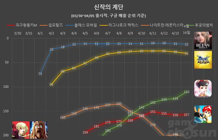 안 아픈 손가락이 없다는 게임사가 애달픈 심정으로 보내게 되는 오픈 첫 주. '신작의 계단' 코너를 통해 지난 한주 간 출시된 주요 신작들의 첫 주말 성적을 알아본다.