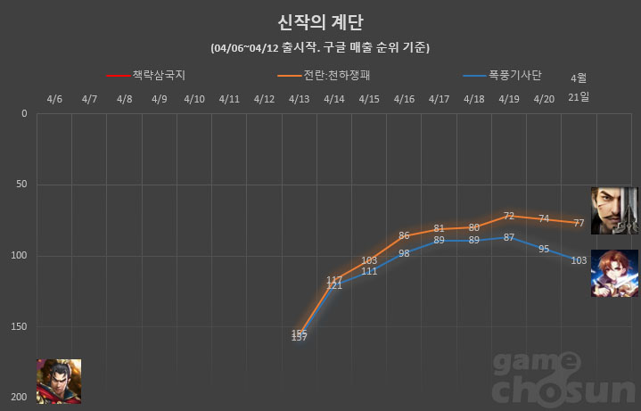 지난주 차트 진입에 성공한 '전란:천하쟁패'와 '폭풍기사단' 모두 첫 주 성적을 어느 정도 유지하고 있는 것으로 나타났다. 동종 장르의 타이틀이 다수 출시되고 있음에도 나타나고 있는 추세라 의의가 있다고 볼 수 있겠다.