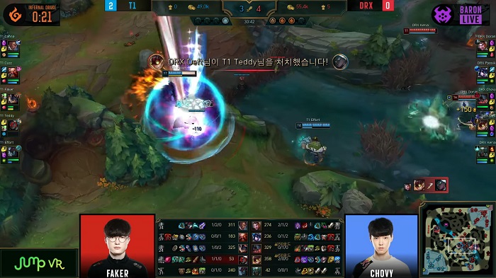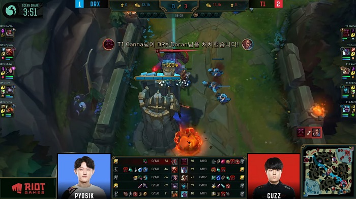 난입을 키스톤으로 채용한 정글 그레이브즈를 제외하면 전반적으로 티원 측이 정석에 가까운 챔피언 구성을 보여줬고 실제로도 초중반 소규모 교전을 모두 승리로 이끌며 경기를 리드했다.