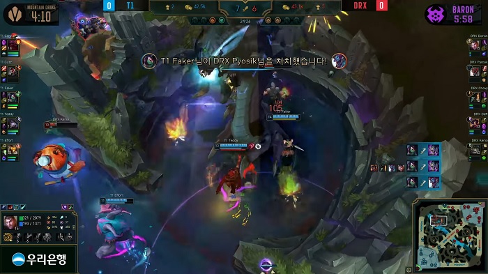그러나 24분경 한타 승리 후 바론을 사냥하던 디알엑스의 정글러 표식(홍창현)이 체력 관리 실패로 인해 몰래 숨어들어온 페이커에게 사망했고 동시에 바론 버프를 헌납하는 대형사고가 발생했다.