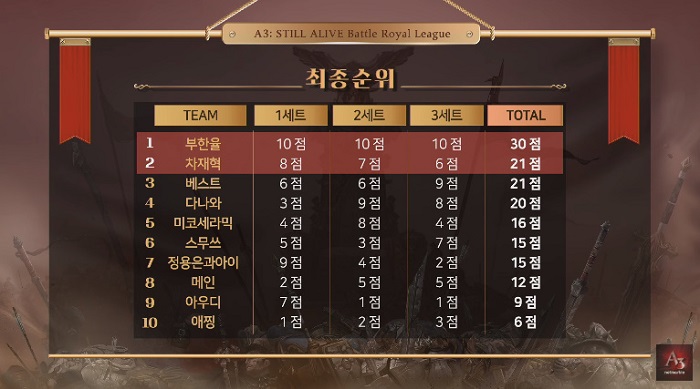 1세트와 2세트에서 연달아 1위를 달성한 '부한율' 팀은 A3BL 프리시즌의 우승이 유력해졌고, 나머지 팀은 준우승을 놓고 치열하게 경쟁하는 양상이 됐다.