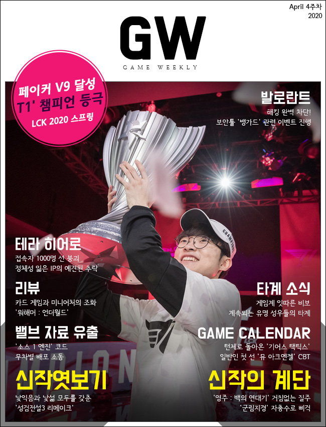신종 코로나 바이러스 여파가 한창인 가운데, LCK 2020 스프링의 결승전이 무관중 경기로 치뤄졌습니다. 결승전에서는 정규 시즌에서 1위, 2위를 차지한 '젠지'와 'T1'이 만났는데요. T1은 지각으로 인해서 밴페이즈 카드 2장을 몰수 당하는, 다소 불리한 출발을 보였습니다. 하지만 경기 결과는 3:0의 T1 완승. 이로써 이제는 구단주가 된 '페이커 (이상혁)' 선수는 통산 9번 째 우승을 거머쥐었으며, MVP로는 '커즈 (문우찬)' 선수는 결승전 MVP로 선정됐습니다.