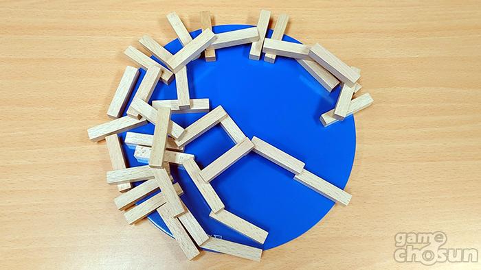 만약 무너진다면 추가 기회를 잃는 것은 물론 무너진 막대기는 자신이 모두 가져가고 이전 플레이어에게 덤으로 막대기 1개를 벌점으로 받기 때문에 신중하게 쌓아야 한다.