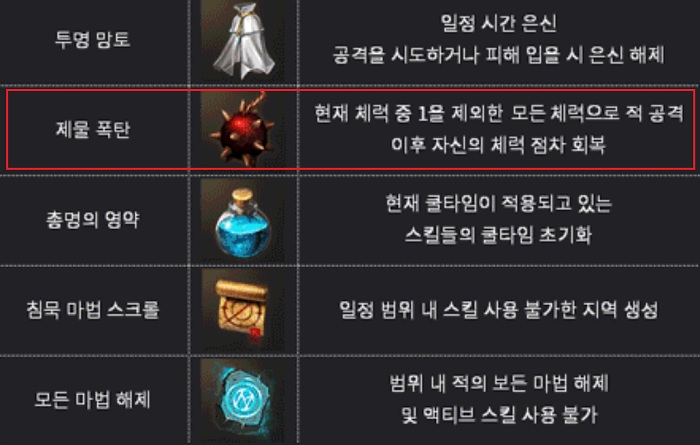 제물 폭탄은 '현재 체력 중 1을 제외한 모든 체력으로 적 공격, 이후 자신의 체력 점차 회복'이라는 효과를 지녔다. 다시 말해서 자신 캐릭터가 보유한 체력 양만큼 상대에게 데미지를 준 후, 자신의 체력을 점차 회복하는 매우 위험도가 높은 아이템이다.