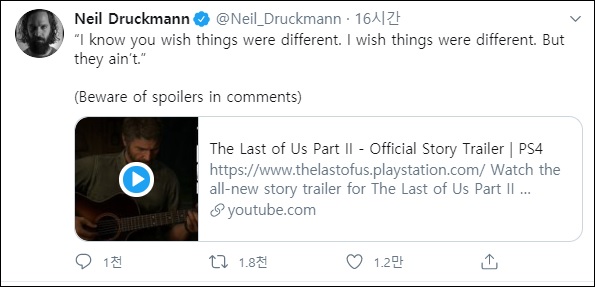 실제로 개발사 너티독의 크리에이티브 디렉터 겸 프로그래머 '닐 드럭만'도 자신의 트위터를 통해 라스트 오브 어스 파트2 트레일러 영상을 공유하면서도 "댓글의 스포일러 조심(Beware of spoilers in comments)"라는 문구를 덧붙이기도 했다.