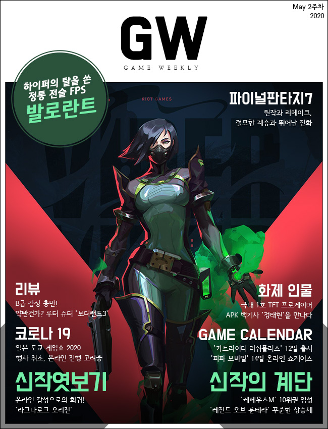 라이엇게임즈는 2020년에 들어서면서 '전략적 팀 전투'와 '레전드 오브 룬테라' 등 신작을 대거 선보이고 있습니다. 여기에 신작 FPS '발로란트'의 비공개 시범 테스트를 진행하면서 또다시 게이머의 이목을 집중시키는 중. 발로란트는 정통 FPS라 여겨지는 '카운터 스트라이크'와 하이퍼 FPS로써 큰 인기를 끌고 있는 '오버워치'를 적절히 배합해놓았다는 것이 중론. 경기는 5vs5로 진행되며, 맵 크기가 크지 않기에 빠르게 게임이 진행됩니다. 카운터 스트라이크의 무기 구매법과 하이퍼 FPS의 각 캐릭터의 고유한 스킬 사용. 침체기에 있는 FPS 시장에 또다시 활력을 불어넣을지 기대됩니다.