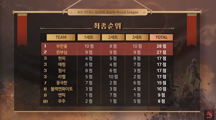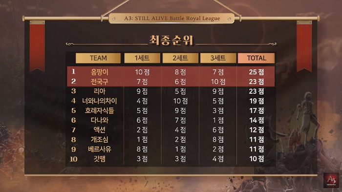 A3BL 경기 중 가장 치열한 양상을 보인 B조, 1위는 '옴팡이' 팀으로 확정되었으며, '전국구' 팀과 '리아' 팀이 공동 2위를 달성했으나, '전국구' 팀이 킬 수에서 앞서면서 시즌 파이널 진출권을 따냈다.
