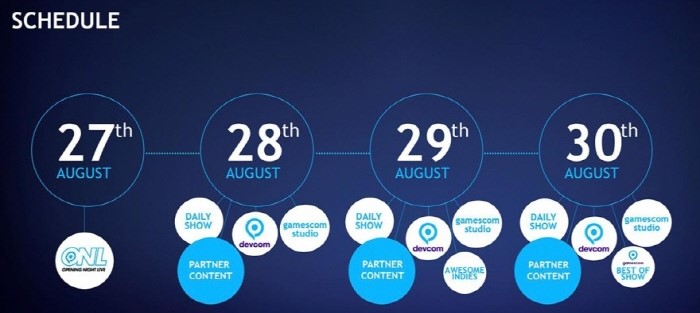 주최 측은 공식 홈페이지와 SNS를 통해 '게임스컴 2020'의 온라인 행사 일정을 밝혔다. 게임스컴 2020은 신작 공개와 게임계 뉴스를 전하는 'Opening Night Live'를 시작으로 게임 쇼와 각 개발사의 프로모션을 전달하는 'Daily Show', 올해 게임스컴을 요약하는 'Best of Show' 등의 행사로 진행된다. 또한 올해부터는 인디 게임 기대작을 소개하는 'gamescom : Awesome Indies'가 개최될 예정이다.