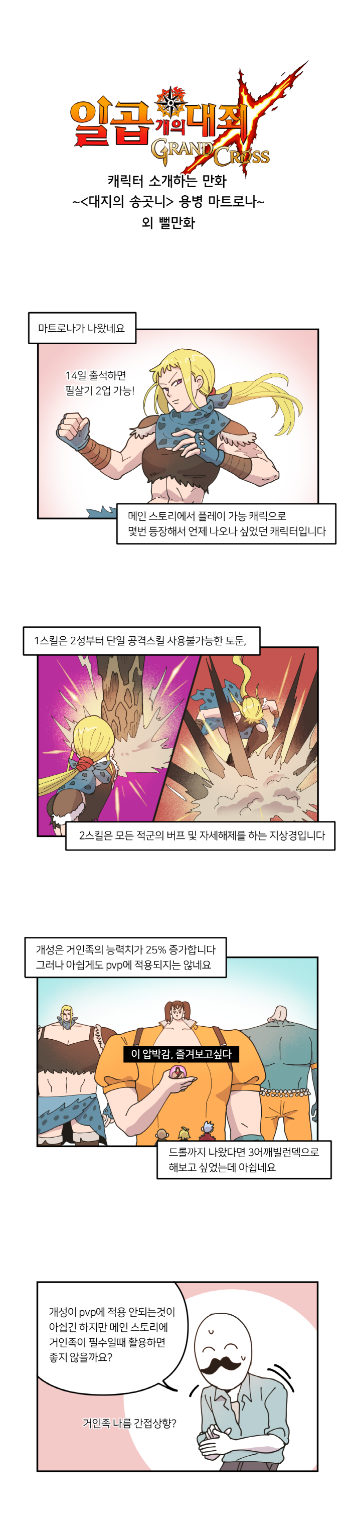 '<대지의 송곳니> 용병 마트로나 (이하 마트로나)'는 웹툰 작가 '국도'가 그린 18번째 영웅으로, 다이앤 이후 최초로 나온 거인족 영웅이기도 하다. 일곱개의대죄 1주년 대축제 전야제 영웅으로 2매까지는 무료로 얻을 수 있다는 것이 특징이다.