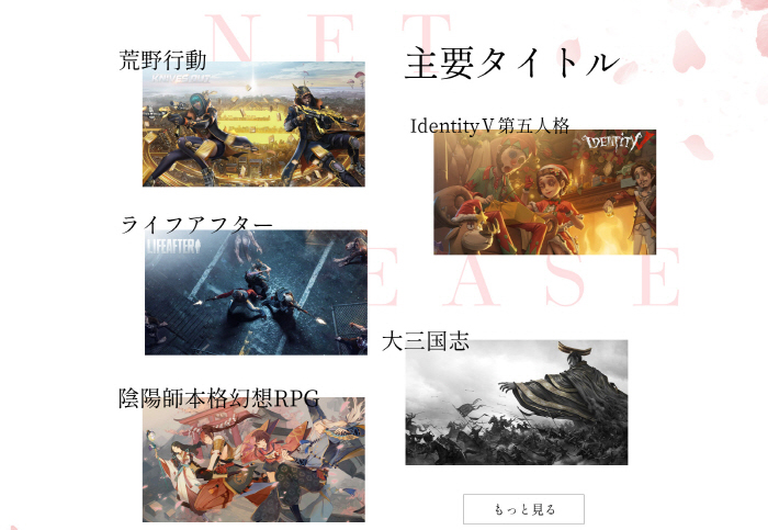 한편, 넷이즈는 한국에서 '음양사'와 '제5인격', '영원한 7일의 도시', '대항의길'을 출시한 바 있다. 중국에선 '월드 오브 워크래프트'와 '오버워치', '스타크래프트2' 등 블리자드 게임을 퍼블리싱했으며, '디아블로' 시리즈의 모바일 후속작 '디아블로 이모탈'의 제작을 맡고 있다. 또한 지난 5월에는 온라인 기자 간담회를 통해 '해리포터 매직 어웨이큰'과 '음양사: 요괴의 집', '프로젝트: 라그나로크', '코드 T', '킹 오브 헌터스'를 발표했다.