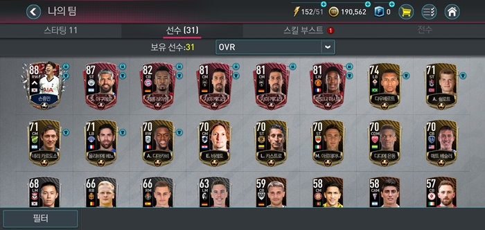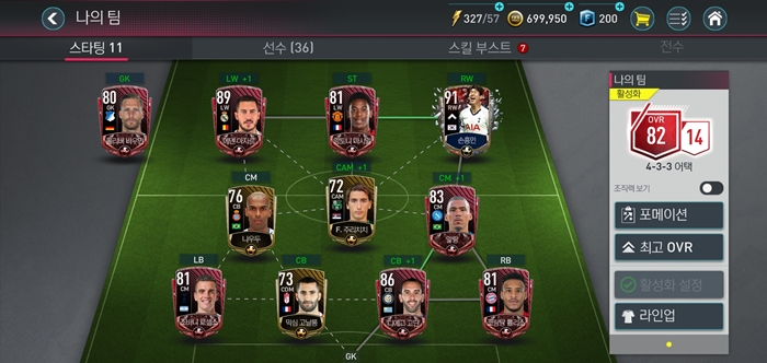 [사진4. FIFA 모바일 게임 내 손흥민 선수 이미지] / [사진5. 선수 관리 메뉴 ‘나의 팀-스타팅11’ 설정 화면]