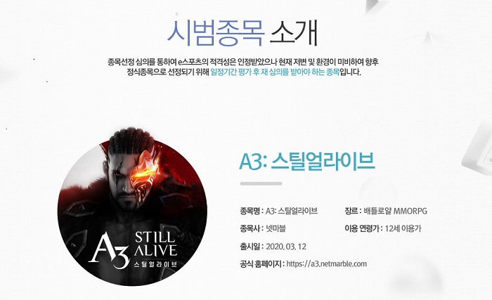 현재 문화체육관광부와 한국e스포츠협회를 통해 공식 e스포츠로 선정된 모바일 게임 대회는 일반 종목 부문에 2종 밖에 존재하지 않으며, 배틀로얄 장르로써는 A3 : 스틸얼라이브가 유일하다. 시범 종목은 일정 기간 평가 후 재심의를 받아야하지만, 공식 e스포츠로써 적격성을 인정받음과 더불어 첫 발을 내딛었기에 그 의의가 크다고 할 수 있다.