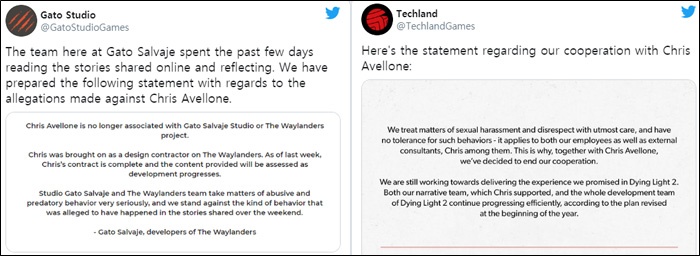 크리스 아벨론의 성추행 폭로와 관련하여 게임사들은 그와 관련된 흔적을 완전히 지우고 있다 = 가토 스튜디오, 테크랜드 공식 트위터