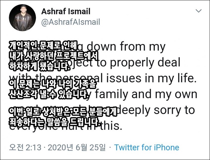 프로젝트 하차 소식을 알린 메시지를 마지막으로 그의 트위터 계정은 폭파됐다 = 아시라프 이스마일 공식 트위터