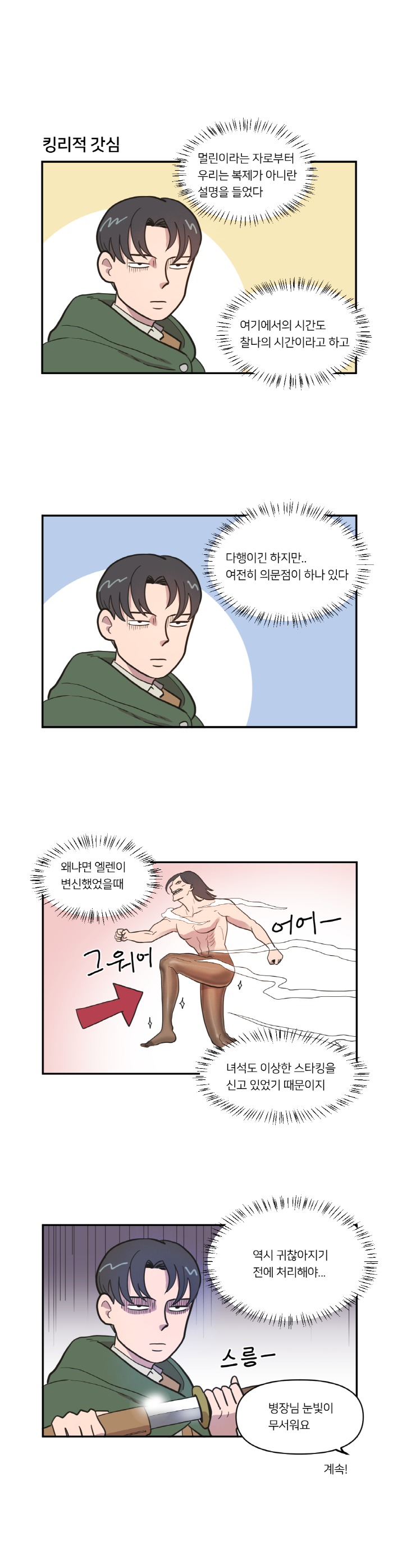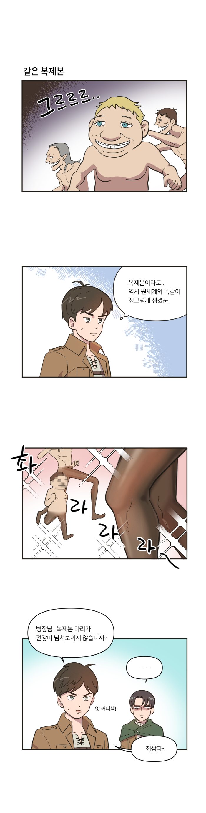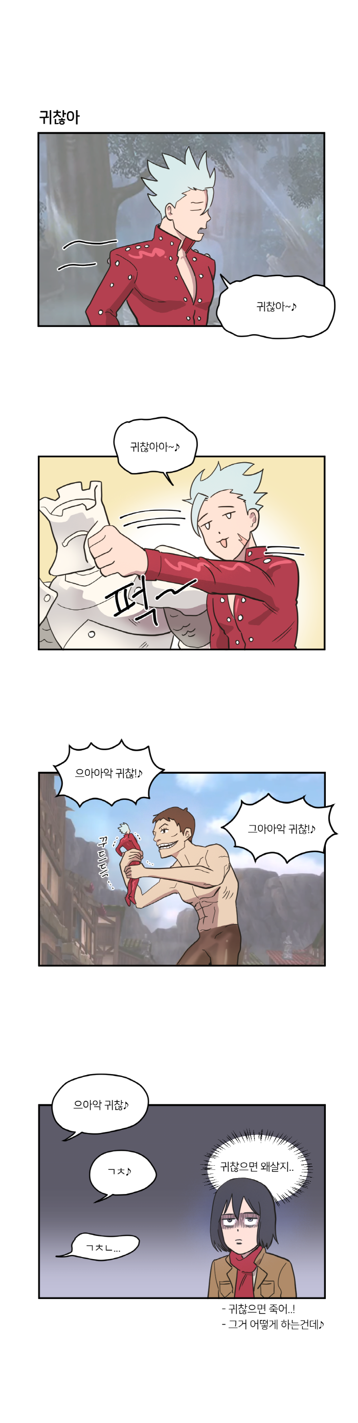 국도 작가는 이번 컬레버레이션을 기념해 외전 형식의 4컷만화를 공개했다. 검과 마법의 세계에 입체기동장치 하나만 들고 등장한 진격의거인 삼인방을 특유의 개그 센스로 해석한 것이 매력 포인트. 일곱개의대죄, 진격의거인 양쪽 팬들 모두 만족할만한 4컷 만화를 직접 확인해보자.