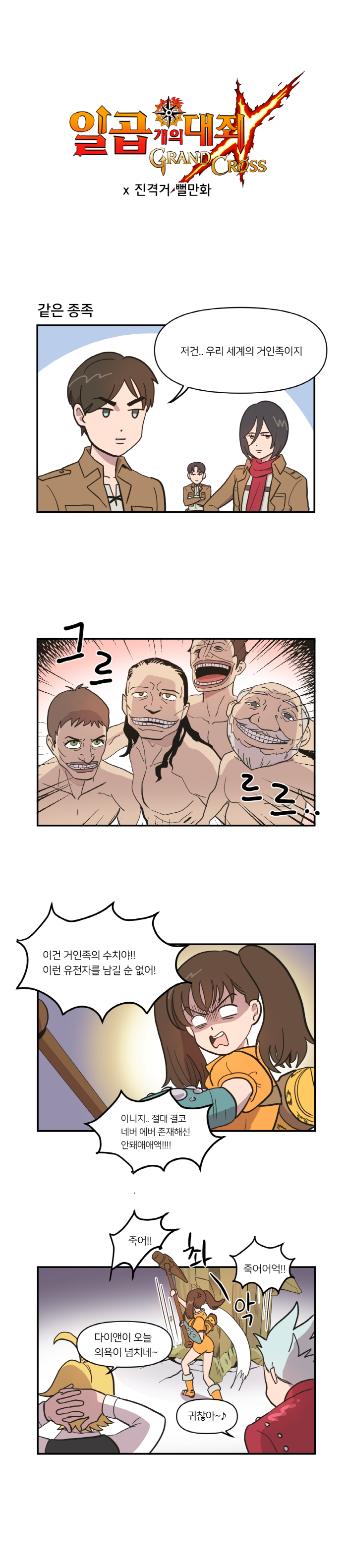 넷마블의 모바일RPG '일곱 개의 대죄 : 그랜드 크로스(이하 일곱개의대죄)'의 신규 웹툰 '일곱개의대죄 x 진격의거인' 컬래버레이션 편이 공개됐다.