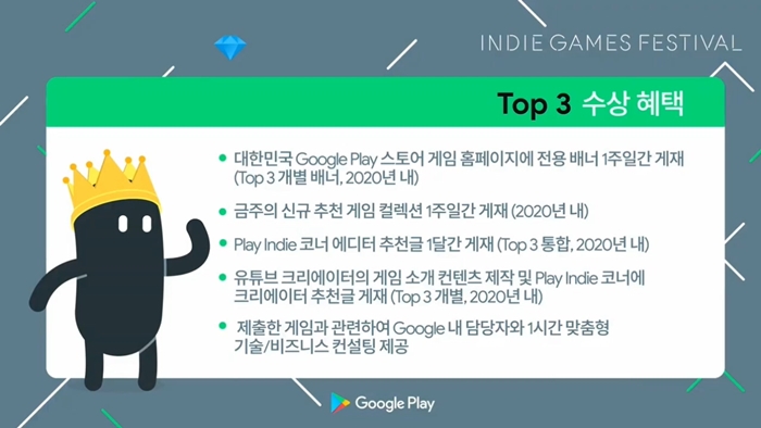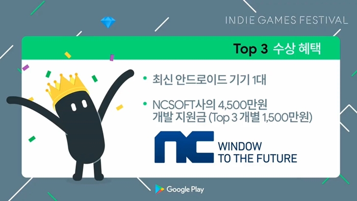 최종적으로 149개의 작품 중 엄선한 TOP 10에서 3개의 작품이 구글 플레이스토어를 통한 전용 배너 게재, 신규 추천 게임 컬렉션 및 에디터 추천글 게재, 제출한 게임과 관련하여 구글 담당자와 맞춤형 기술/비즈니스 컨설팅을 제공받는 혜택이 주어지며 이번 행사의 주요 스폰서인 NC소프트는 각 1,500만원씩 총 4,500만원의 개발 지원금을 수여한다.
