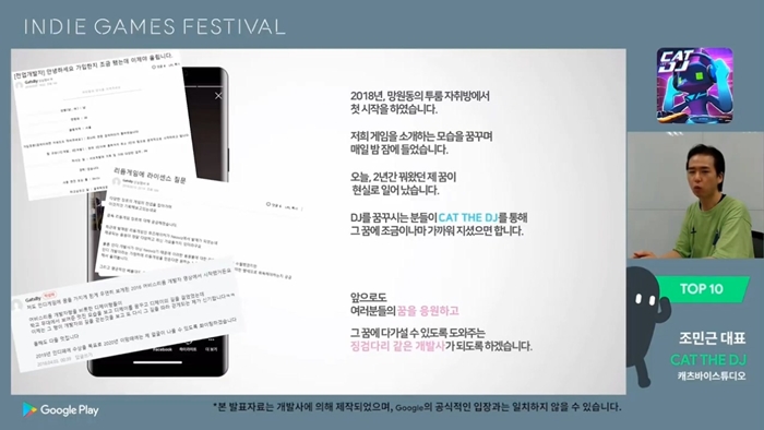 발표 내용 중에서는 클럽 DJ로 활동하다가 구글플레이 인디 게임 페스티벌 영상을 보고 기타, 피아노와 같은 레슨 게임이 존재하지 않는 '디제잉'의 대중화를 위해 무턱대고 개발에 뛰어들었고 2년의 시행착오를 거쳐 기어이 게임을 완성해낸 '캣 더 디제이' 캐츠바이스튜디오의 이야기가 가장 큰 화제였다.