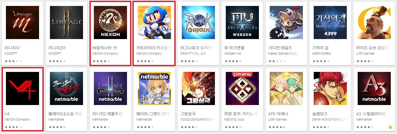 5일 기준 넥슨은 자사의 게임 3개를 구글 최고매출 10위권 안에 올려두고 있다. = 구글 플레이스토어 갈무리