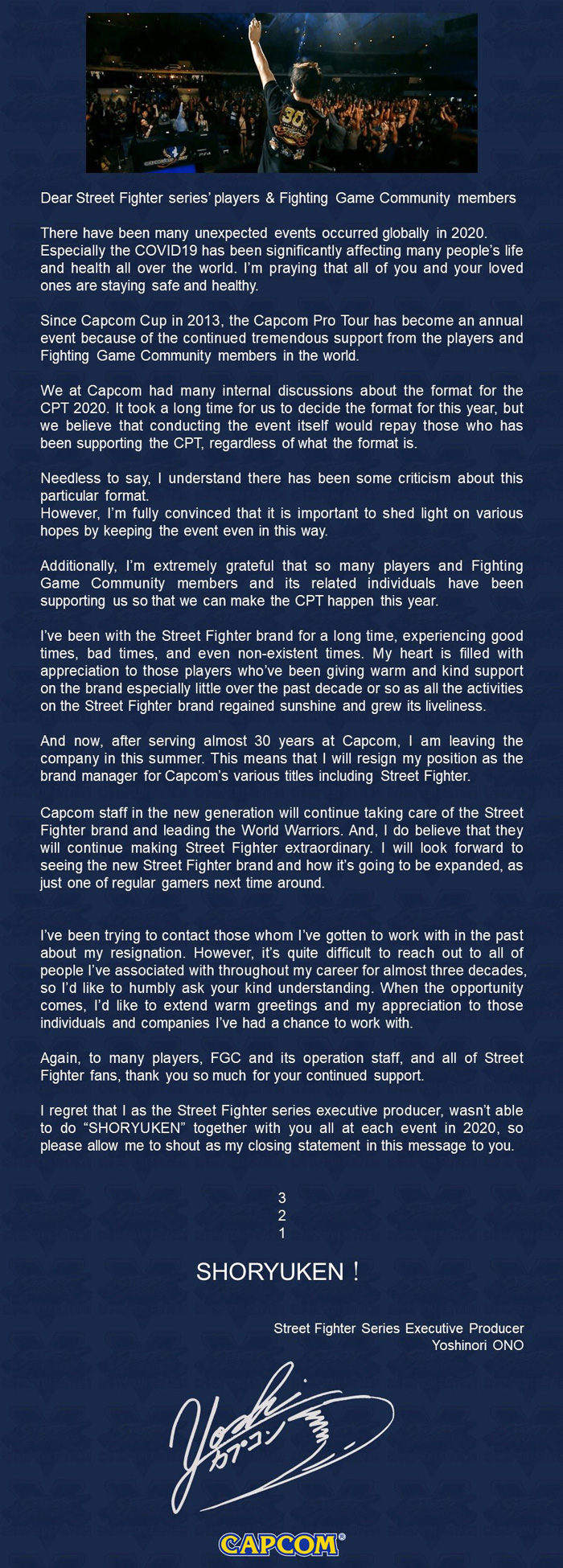 또, 그는 퇴사 소식을 전하는 글 말미에 "스트리트 파이터 시리즈의 프로듀서로서, 2020년 이벤트에서 함께 '쇼류켄'을 외치지 못해 유감스럽다"고 밝히면서, 마무리 멘트로 쇼류켄을 외치며 재치있는 모습을 보여줬다.