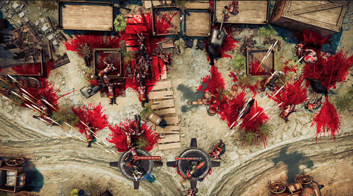 가장 먼저 눈에 띄는 것은 바로 '유혈'이다. 총에 맞은 적은 피바다를 만들어 전투의 쾌감을 선사한다. 탑뷰 시점과 유혈이 낭자하는 그래픽은 '핫라인 마이애미'를 떠올리게 만드는 부분. 대신 갓즈 트리거는 최대 2인까지 멀티 플레이를 제공해 차별화를 꾀했다. 물론 혼자서 두 캐릭터를 번갈아 가며 조작해 무쌍을 펼치는 것도 가능하다.