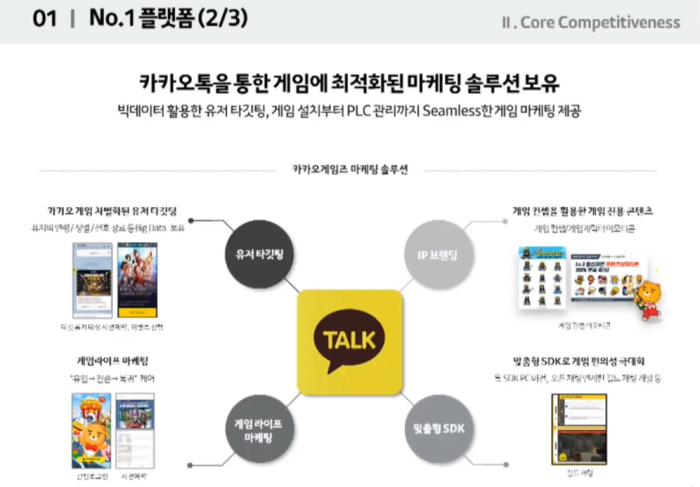 남궁훈 대표는 카카오게임즈가 개발부터 퍼블리싱, 플랫폼까지 모든 밸류 체인을 보유한 회사라고 설명했다. 다음 게임즈와 합병해 카카오 게임즈가 된 이후 올해는 엑스엘 게임즈와 합병으로 개발력까지 갖췄으며, 카카오톡이 가진 플러스 친구와 친구 추천과 카카오톡 등 플랫폼 경쟁력을 통해 게임에 최적화된 마케팅 솔루션을 보유했다고 전했다.