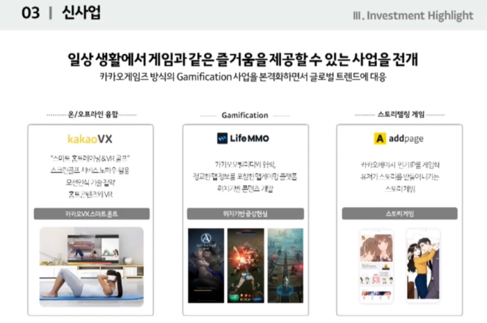 남궁훈 대표는 일상생활에서 게임과 같은 즐거움을 제공할 수 있는 신사업을 전개할 것이라고 전했다. 스마트 홈트레이닝, 카카오모빌리티와 협력을 통해 위치 기반 게임, 카카오 페이지 인기 IP를 기반으로 만든 스토리텔링 게임 개발 중이라고 밝혔다.