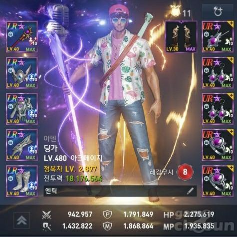 아크메이지를 플레이하고 있는 아덴 서버 엔틱 혈맹 부군주 '딩가'입니다. 현재 전투력은 1800만이구요. 한 때 전서버 1위 아크메이지였지만 최근에는 신규 콘텐츠의 뽑기 실패로 순위가 떨어져서 3위 정도 되는 것으로 알고 있습니다.