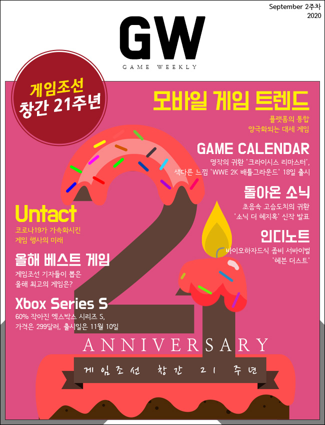 1999년 첫걸음을 내디딘 게임조선이 올해로 창간 21주년을 맞이했습니다. 매년 게임조선은 창간에 맞춰 게임 산업과 관련된 다양한 주제를 다뤄왔는데요. 올해의 주제는 '게임의 미래'로 선정했습니다. 급변하는 게임 산업의 환경과 트렌드 속에서 과연 게임이 어떻게 진화하고 대처해나갈지 함께 살펴보도록 하시죠! 아! 그리고 게임조선 21주년을 축하해주시는 독자분들을 위해 자그마한 이벤트를 준비했으니, 꼭! 참여하시고 소정의 상품을 받아가시길 바랍니다.