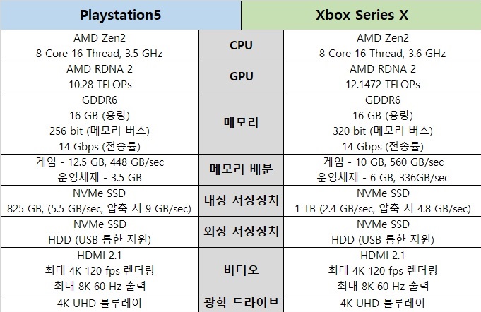 우선 사양에 있어서는 엑스박스 시리즈 X가 플레이스테이션5에 비해 조금 더 우위에 있는 것으로 보인다. 두 콘솔 모두 AMD Zen2 기반의 라이젠 커스텀 마이크로 아키텍처를 사용하지만, GPU의 경우에는 플레이스테이션5가 10.28 테라플롭스, 엑스박스 시리즈 X가 12.14 테라플롭스로, 엑스박스 시리즈 X가 조금 더 앞선다. 이외에도 두 기기 모두 NVMe SSD를 장착하고 있지만 엑스박스 시리즈 X가 1TB로, 플레이스테이션5에 비해 약 175GB 더 크다. 대신 입출력 속도는 플레이스테이션5가 더 빠른 것으로 확인됐다.