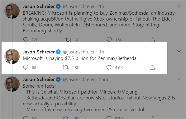 한편, 호주의 게임 웹진 '코타쿠'의 전 편집장 '제이슨 슈라이어'는 자신의 트위터를 통해 '마이크로소프트가 제니맥스/베데스다를 인수하기 위해 75억불(한화 약 8조 7260억원)을 지불했다'고 밝혔다.