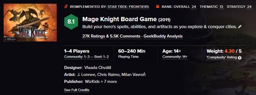 블라디 크바틸의 대표작이라면 문명 테마의 보드게임 '쓰루 디 에이지스'가 있겠지만, 그에 못지않게 큰 인기를 끄는 것이 바로 메이지 나이트입니다. 마법사 기사라는 기묘한 네임의 이 보드게임은 판타지 테마의 보드게임입니다. 전 세계 최대 보드게임 사이트인 보드게임긱에서 현재 24위를 차지하고 있는 게임으로, 게임 자체는 1~4인용이지만, 1~2인용을 권장하고 있습니다.