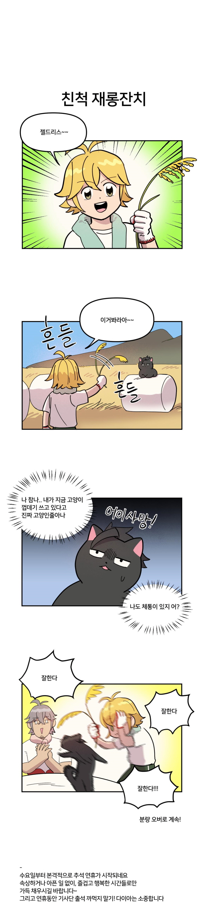 이번 웹툰은 추석 명절을 맞아 특집편으로 구성됐다. 마신 삼형제인 멜리오다스, 에스타롯사, 젤드리스가 시골에 내려가 일손을 도와준다는 내용. 원작은 하루가 멀다하고 싸우는 적이지만 만화만큼은 우애좋은 형제로 표현된 셈이다.