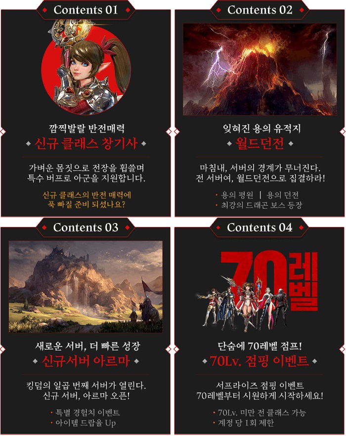 롱런의 발판을 마련하는 첫걸음으로 준비한 것이 바로 역대급 대규모 업데이트다. 킹덤 : 전쟁의 불씨가 처음으로 진행하는 대규모 업데이트에서는 '신규 클래스'와 '월드 던전', '신규 서버'를 선보일 예정임에 따라 기존 이용자 뿐만 아니라, 복귀를 준비하는 이용자 및 신규 이용자에게 큰 기대감을 심어주고 있다.