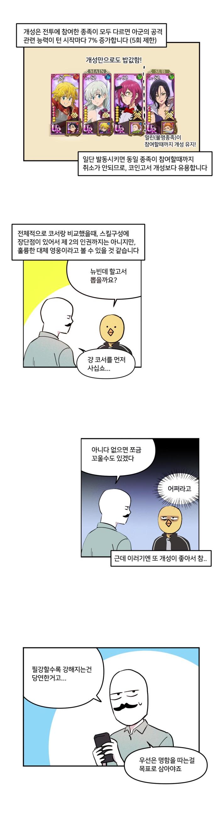 할로윈 이벤트를 통해 공개된 '[할로윈] 성기사 고서'는 최고 티어로 평가받는 '[색욕의 죄] 성기사 고서'와 상당히 흡사한 영웅이다. 핵심 스킬인 '인베이전 애로'와 필살기 '리라이트 라이트'가 동일하기 때문. 여기에 1스킬 '다크니스 할로윈'은 1레벨부터 적 전체에 필살기 게이지를 감소시키는 특성이 있어 PVP에서 큰 효력을 발휘한다. 단, 적 턴이 종료된 후 게이지가 감소되기 때문에 미리 깔아두는 방식으로 스킬을 사용해야 효율적으로 사용할 수 있다.