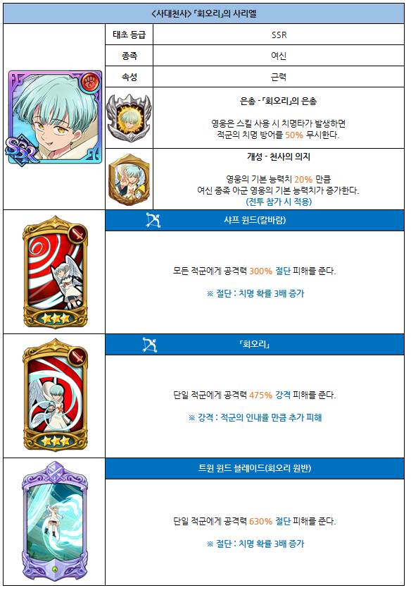 사리엘은 타르미엘과 반대로 공격적 성향이 강하다. 사리엘은 기본적으로 치명 확률과 치명 피해가 높은데다가 1스킬 '샤프 윈드'는 모든 적에게 절단(피명 확률 3배 증가) 피해를 줄 수 있다. 2스킬 '회오리'는 단일 적군에게 강격(적군의 인내율 만큼 추가 피해) 속성 피해를 입힌다. 필살기 '트윈 윈드 블레이드'는 단일 적군에게 최대 945% 절단 피해를 주기 때문에 한 명을 반드시 죽이는 용도로 쓸 수 있다.