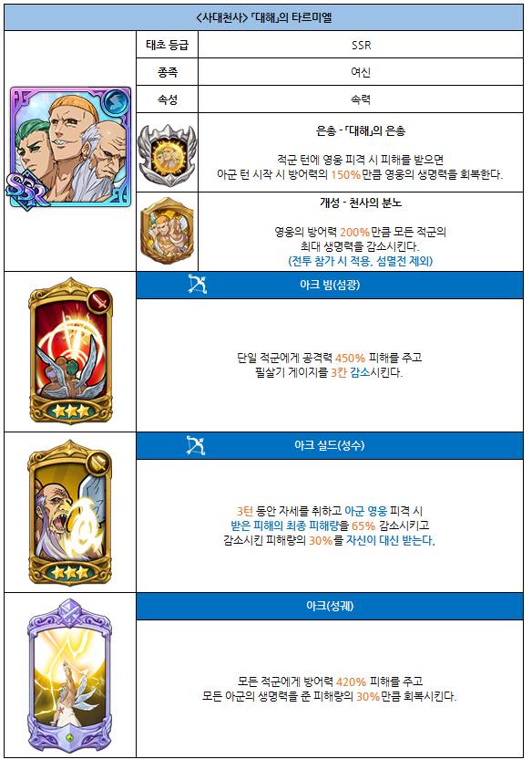 일곱 개의 영웅 신규 영웅도 공개됐다. 이번에 공개된 신규 영웅은 사대천사의 남은 두 명, '<사대천사> [대해]의 타르미엘(이하 타르미엘)'과 '<사대천사> [회오리]의 사리엘(이하 사리엘)' 이다