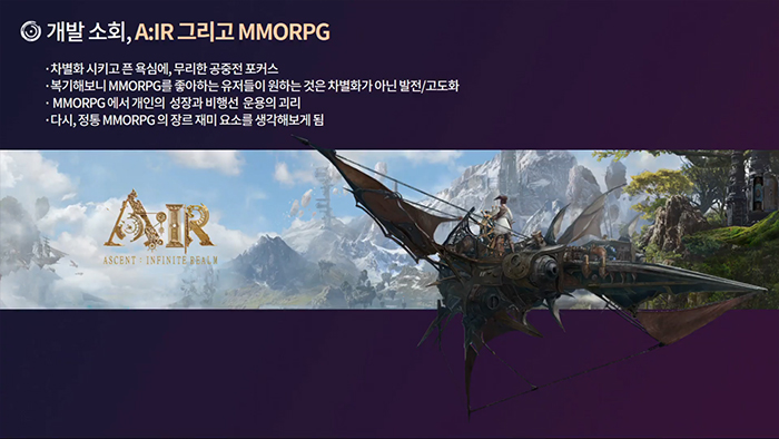 에어가 공중전과 다양한 탈것 오브젝트로 '차별점'에 주안을 두었다면, 오히려 그러한 요소가 독으로 작용했다는 내부적 평가가 있어 엘리온은 차별화보다는 MMORPG의 요소를 발전, 고도화 시키는 데 중점을 두었다. MMORPG에서만 경험할 수 있는 요소를 더욱 강화해 기존 MMORPG에게는 익숙하면서도 더 재미난 게임을 기대해볼 수 있을 듯하다.