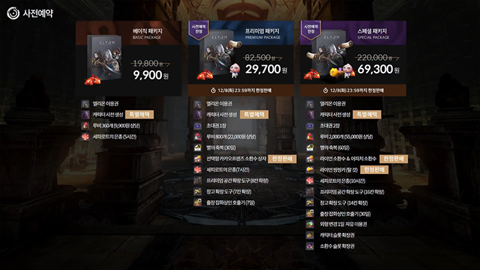 카카오게임즈는 엘리온의 사전예약을 진행하며, 9,900원의 베이직 패키지부터 사전예약 특별 할인이 포함된 프리미엄 패키지와 스페셜 패키지를 공개하기도 했다. 이중 스페셜 패키지에는 카카오의 간판 캐릭터인 라이언 소환수와 어피치 소환수, 라이언 빵빵카 등이 포함돼 눈길을 끌기도 했다.